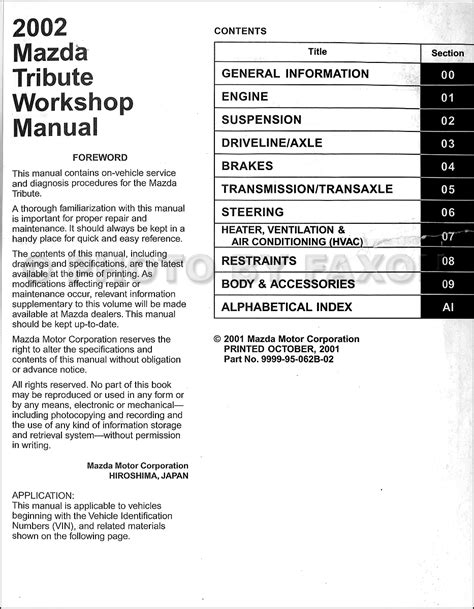 Download 2002 mazda tribute workshop manual PDF By Click Button. 2002 mazda tribute workshop manual it’s easy to recommend a new book category such as Novel, journal, comic, magazin, ect. You see it and you just know that the designer is also an author and understands the challenges involved with having a good book. You can easy klick for detailing book and you can read it online, even you can download it